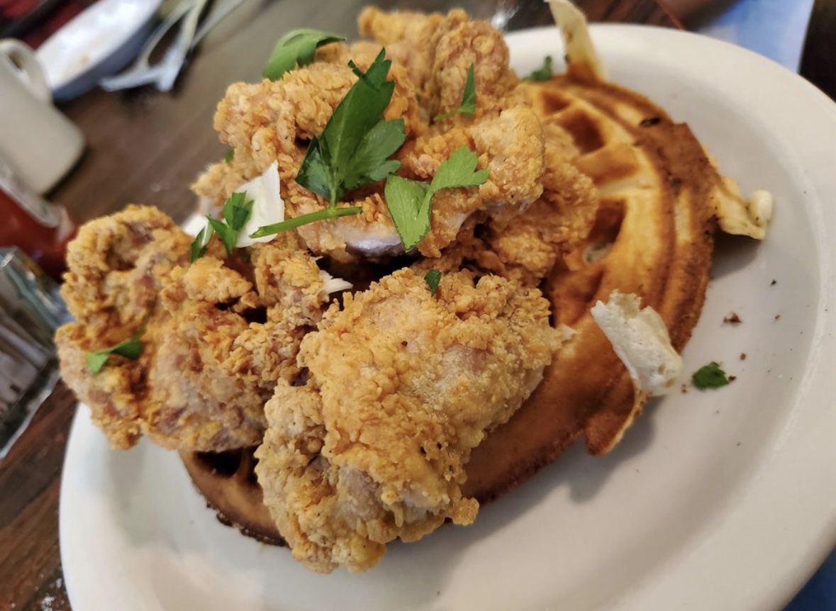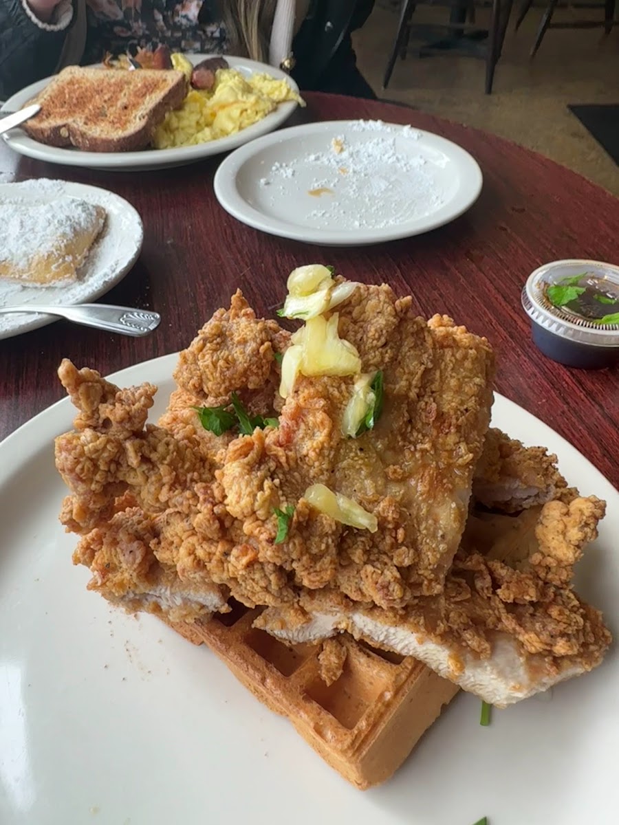 The café specializes in an array of dishes that are sure to tantalize your taste buds. Start your day with their renowned Beignets—French doughnuts, fried to perfection and dusted with powdered sugar, available for just $8.95. For a hearty breakfast, dive into their scrumptious Chicken and Waffles, where the crispy, spiced chicken harmonizes beautifully with fluffy waffles smothered in garlic butter and a surprising touch of spicy syrup—a dish that has garnered rave reviews from locals and visitors alike for its exquisite explosion of flavors.